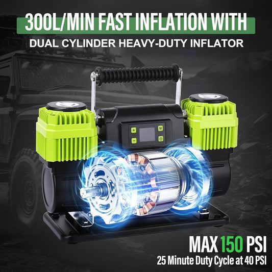 Portable Air Compressor 12V Dual Cylinder Portable Inflator 12.3 CFM with Digital Pressure Gauge, Auto Stop, Preset Target, and OffRoad Capability - Fast Inflation for Car, Truck, and SUV Tires