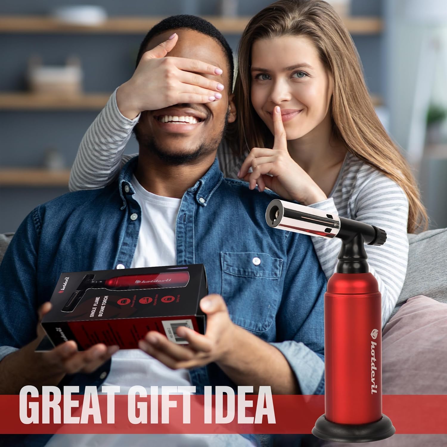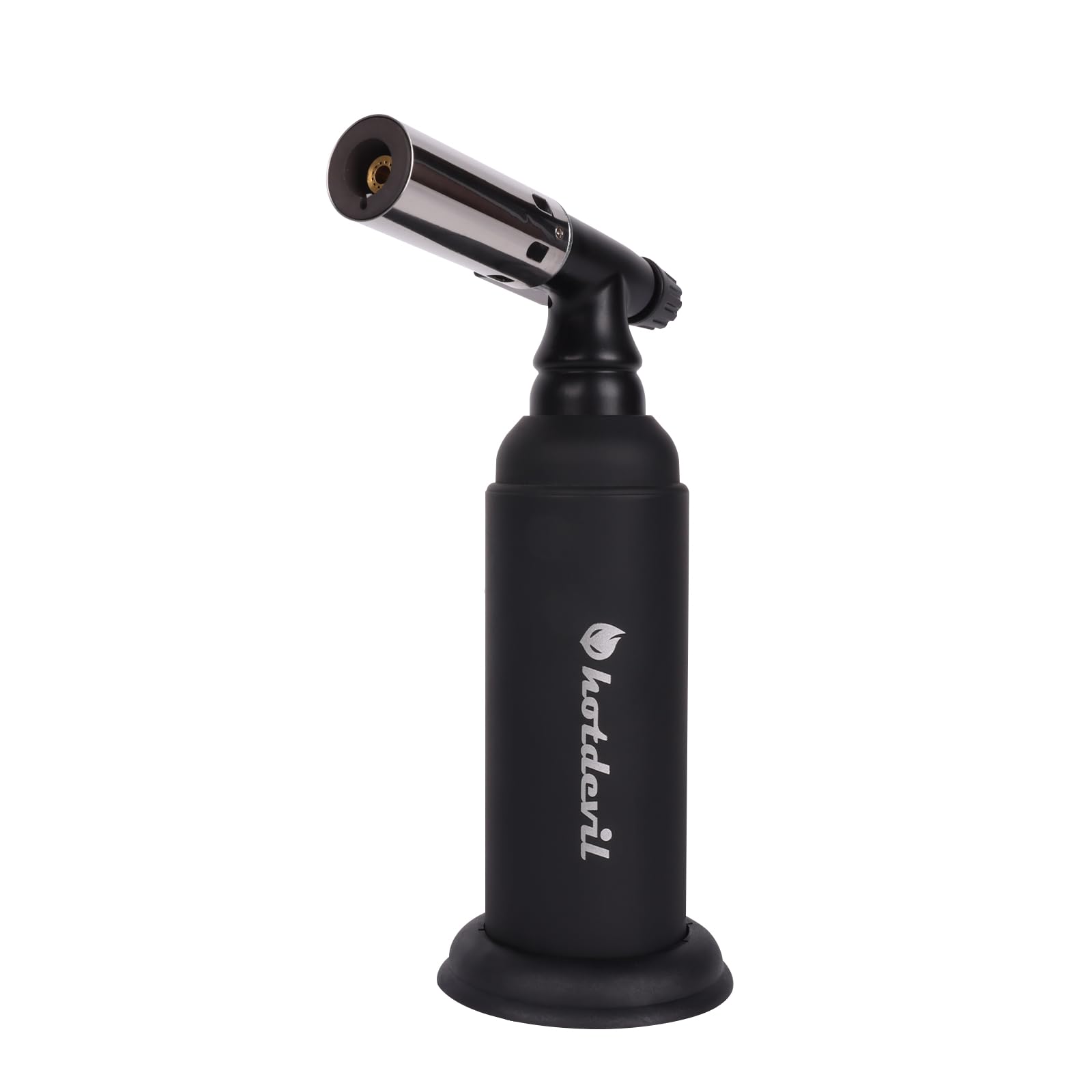 - 【Single Flame & Adjustable Flame】Hotdevil butane torch can spray powerful flame and create a continuous flame up to 6 inches long with a temperature of 1370 °C/2498 °F.Designed with Piezo self-ignition, just push the trigger start button to light up,allows use at any angle or even upside-down.Adjustable flame knob allowing you to freely control the flame size to meet your needs.